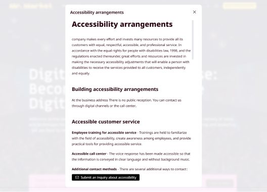 Every business is required to have an online accessibility statement detailing the actions taken to make the site accessible, information about accessibility actions the business offers, and the contact details of the accessibility coordinator in the organization. Gllow allows you to fill in the relevant details for your business and automatically creates a personalized accessibility statement for you.