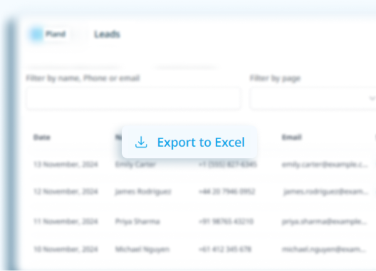 Gllow allows you to export all the leads you've received from your site and landing pages, or filter by a specific landing page. Additionally, every lead that enters the system will automatically be sent to an email you can set in your account.